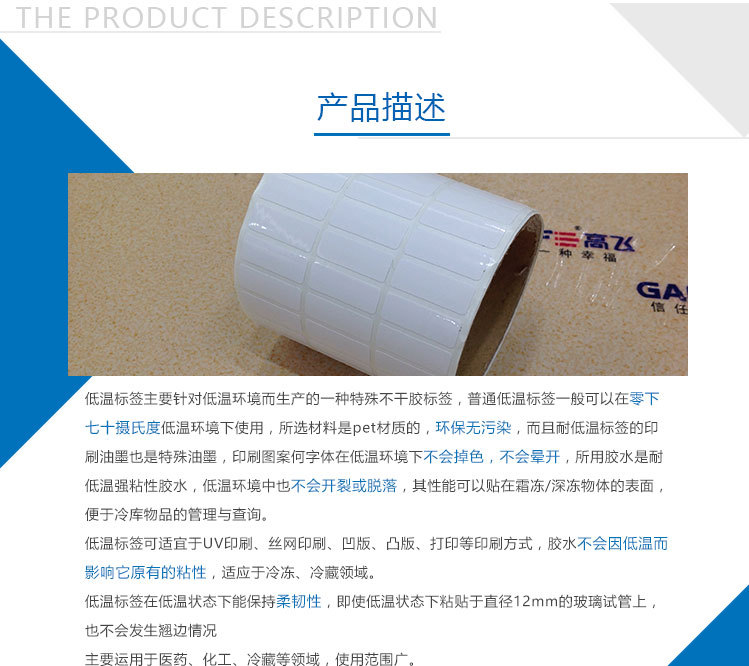 1、標簽的膠水不滲入物體產品表面,平且膠水在低溫狀態(tài)(零下70度或更低)保持相當的粘力,保持不脫落。