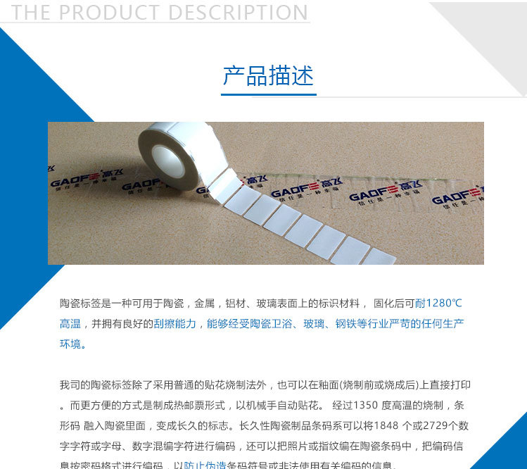 陶瓷標簽可以用于金屬,陶瓷,玻璃產(chǎn)品的識別和條碼管理。固化后標簽和打印圖像能夠耐1280℃高溫和優(yōu)異的耐摩擦性能。