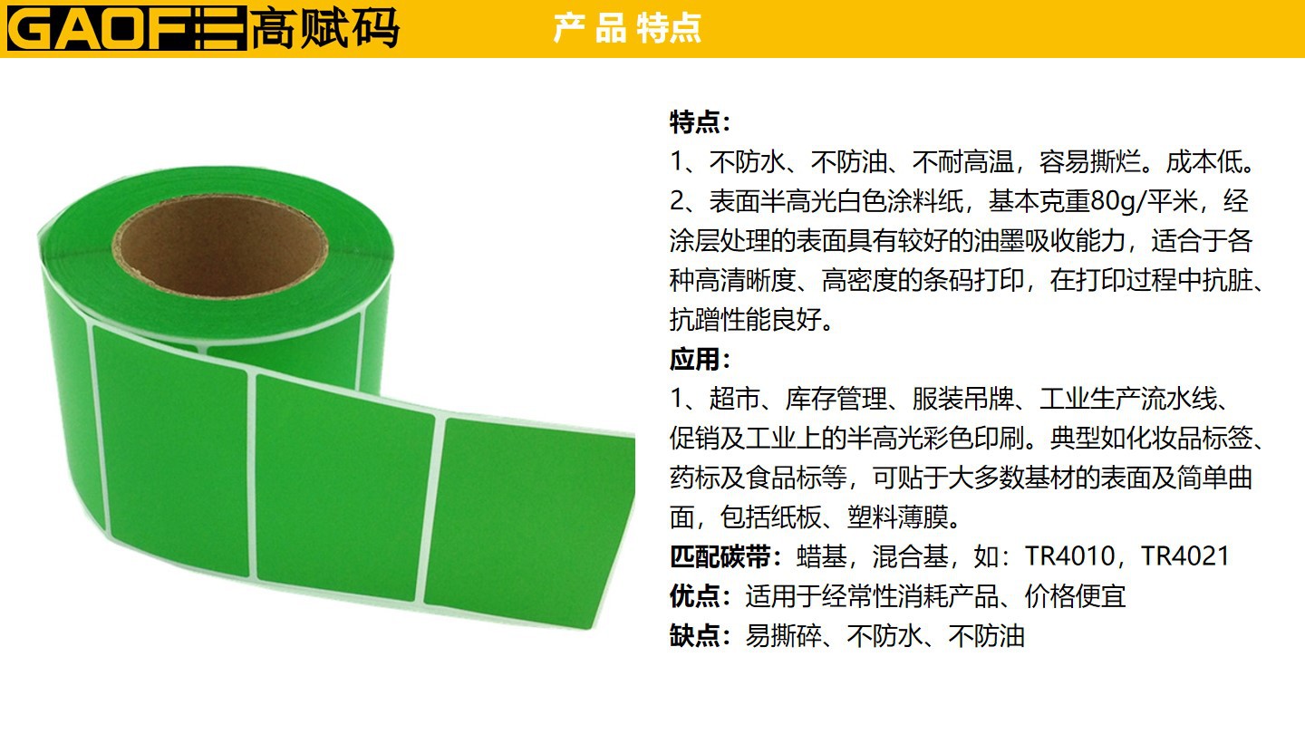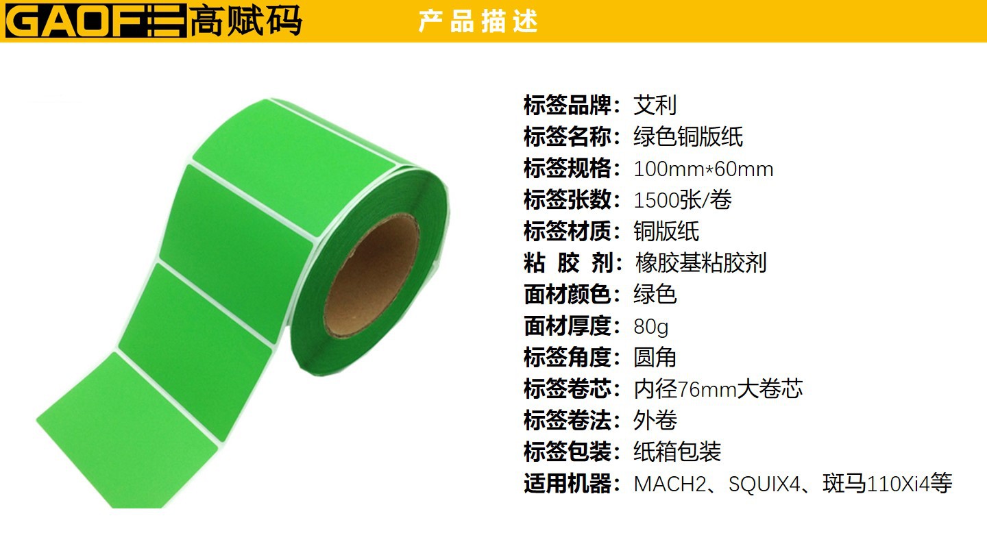 綠色不干膠標(biāo)簽紙 100mm*60mm 強粘性標(biāo)簽紙 彩色5209銅版-高賦碼
