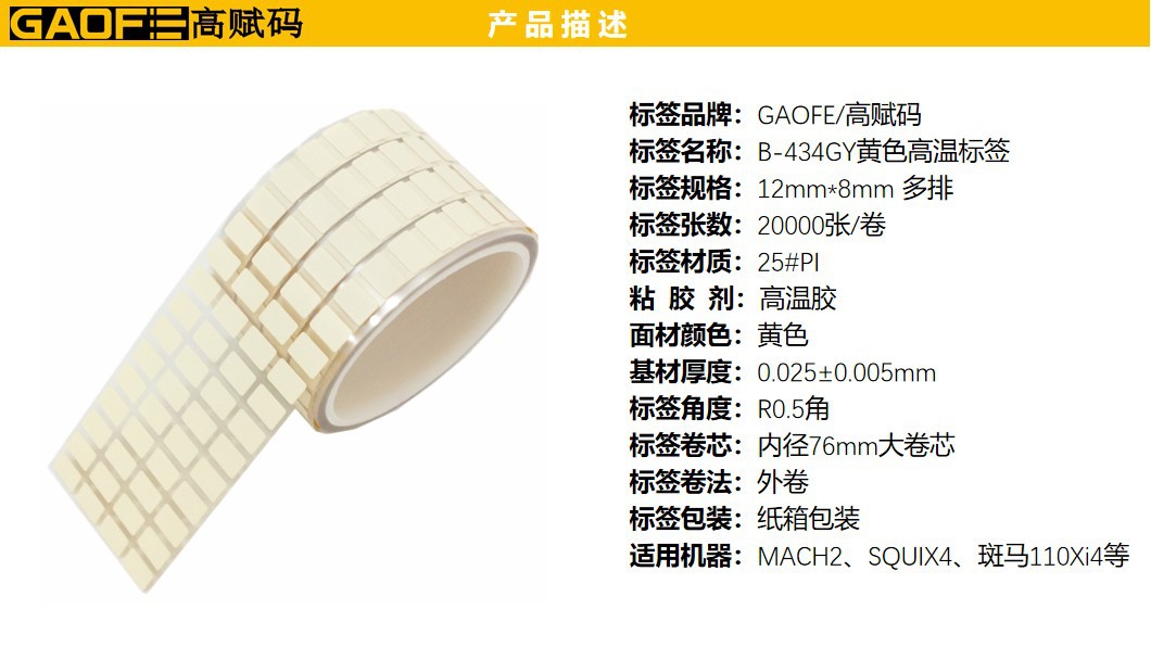 高溫標(biāo)簽 B-434GY 黃色色高溫PI 12mm*8mm 電子行業(yè)-高賦碼
