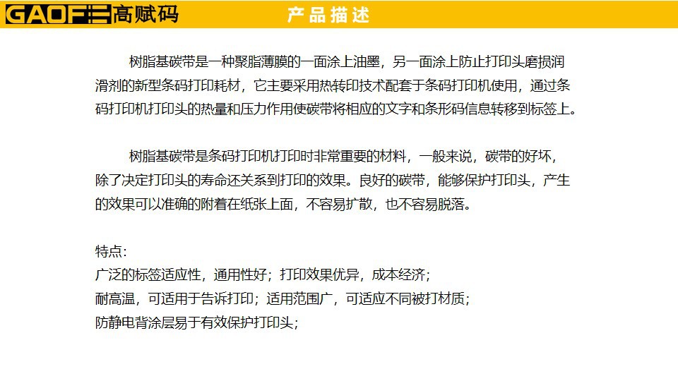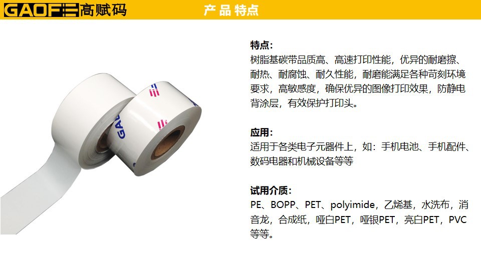 洗水嘜碳帶品質(zhì)高、高速打印性能,優(yōu)異的耐磨擦、耐熱、耐腐蝕、耐久性能,耐磨能滿足各種苛刻環(huán)境要求,高敏感度,確保優(yōu)異的圖像打印效果,防靜電背涂層,有效保護打印頭。