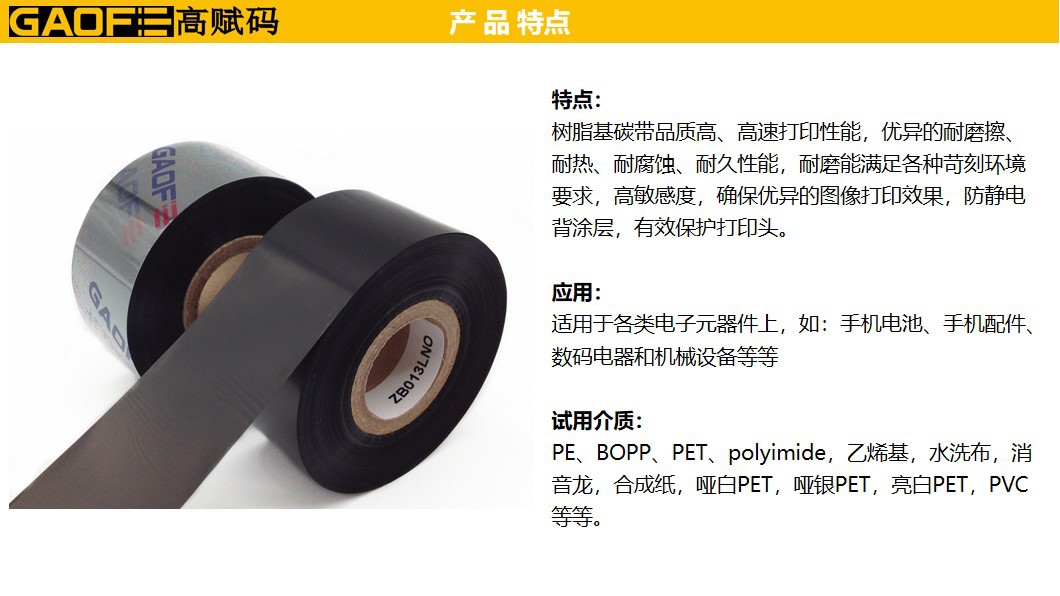 樹脂基碳帶品質(zhì)高、高速打印性能,優(yōu)異的耐磨擦、耐熱、耐腐蝕、耐久性能,耐磨能滿足各種苛刻環(huán)境要求,高敏感度,確保優(yōu)異的圖像打印效果,防靜電背涂層,有效保護(hù)打印頭。