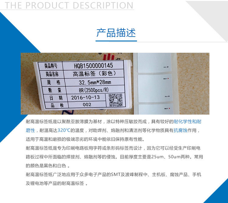 高溫標簽聚酰亞胺薄膜為基材,涂以特種壓敏膠而成,具有較好的耐化學性和耐磨性,耐溫范圍200℃~600℃,對助焊劑、熔融劑和清潔劑等化學物質(zhì)具有抗腐蝕作用,使用于高溫和磨損的極端惡劣的環(huán)境中能保持原本性能。它是專為印刷電路板用字符或條形碼標簽而設計,因為它可以經(jīng)受生產(chǎn)印刷電路板過程中所面臨的焊接劑、熔融劑等的侵蝕。目前厚度主要是25um、50um兩種。常用的顏色是黑色和白色 。高溫標簽廣泛地應用于眾多電子產(chǎn)品的SMT及波峰制程中、主機板、腐蝕產(chǎn)品、手機及鋰電池等產(chǎn)品的PCB板高溫標簽。