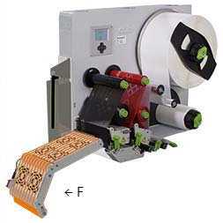 吸附式輸送帶貼標(biāo)手臂位于剝離板前。打印完成的標(biāo)簽會(huì)藉由吸附式輸送帶傳送至剝離位置并透過外部信號貼標(biāo)于包裝上。在剝離過程中可同時(shí)打印下一張標(biāo)簽。