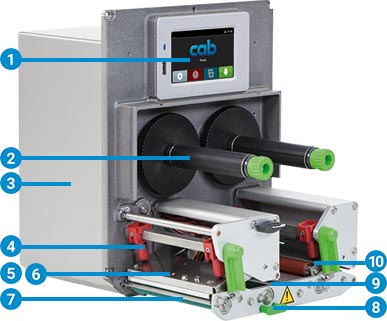 標(biāo)簽剝離之后,下一張標(biāo)簽會(huì)退回打印頭后方。借此確保標(biāo)簽前緣仍可打印并防止殘膠因長(zhǎng)時(shí)間等待而溢出。使用敏感材質(zhì)時(shí),打印頭可抬起以避免碳帶起皺折。
